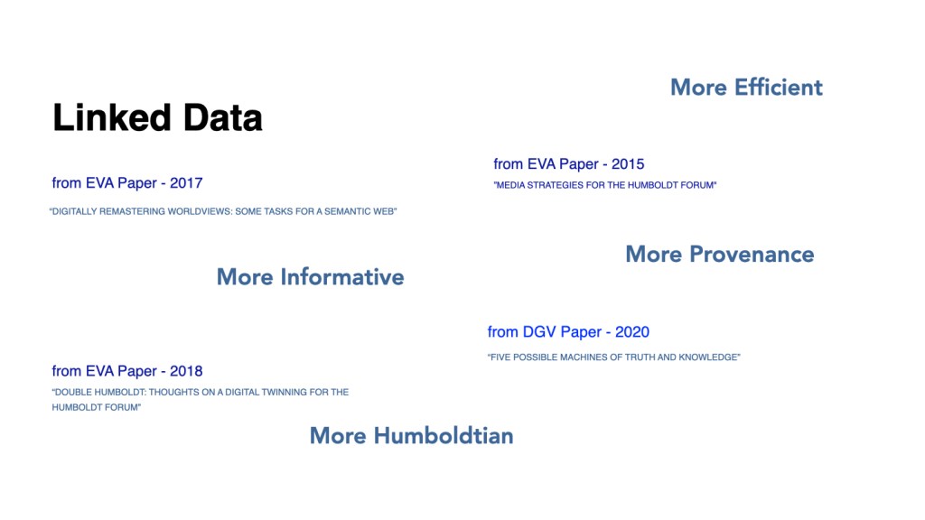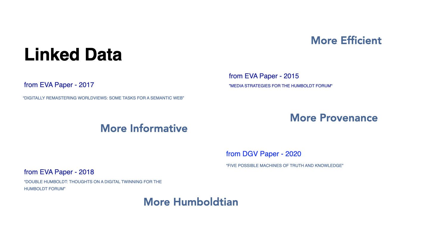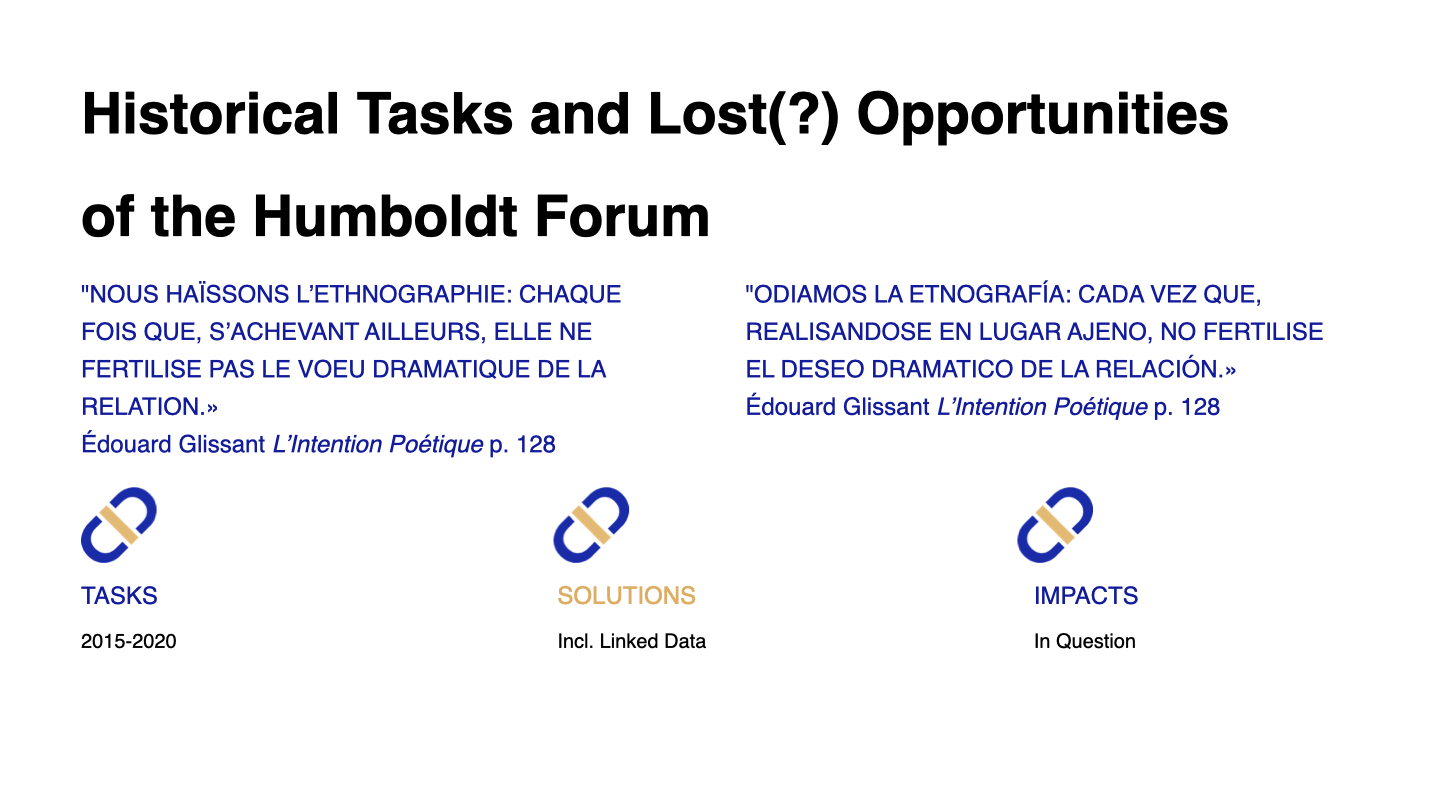 linked data pratice yielding solutions for online collections display that are: a) more informative, b) more efficient in production, c) more Humboldtian in spirit (i.e. more « on Brand » for the Humboldt Forum and d) more helpful for surfacing and telling provenance stories.