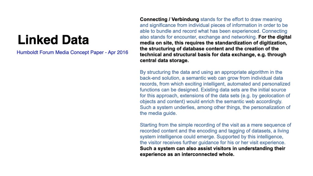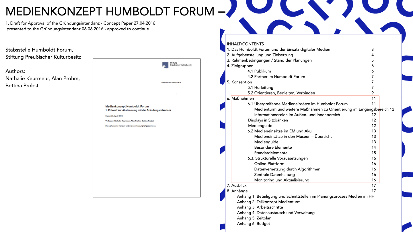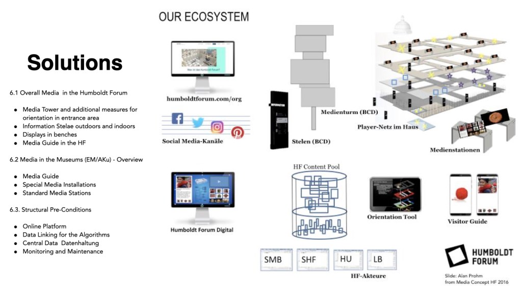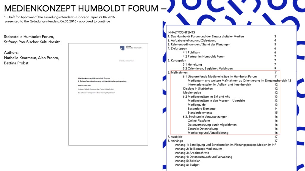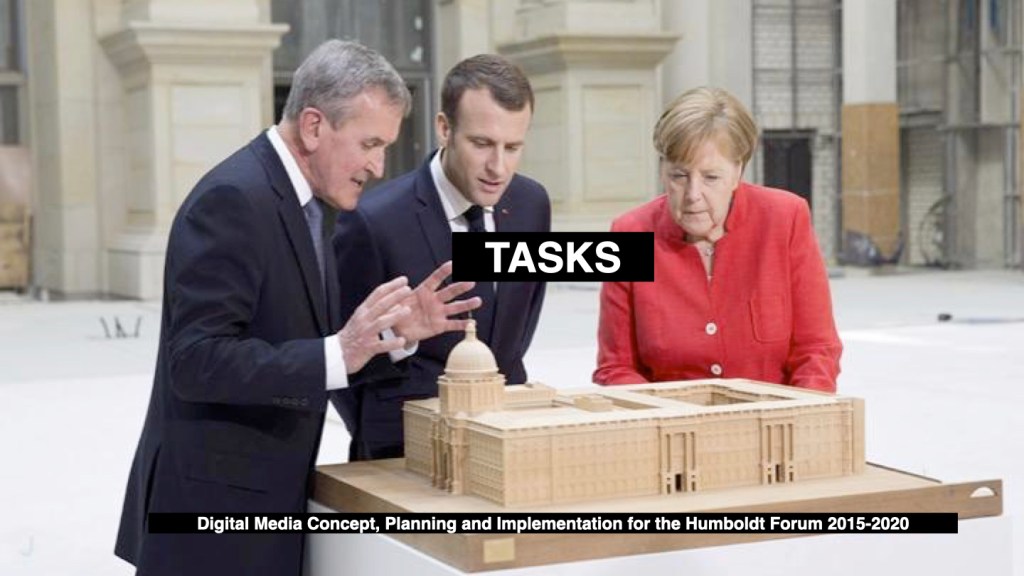 I encountered the task with the publication of a job opening (in Jan. or Feb. of 2015) for « Overarching Media Concept/Mediengesamtkonzept » for the then still just incipient Humboldt Forum. It was published by the Staatliche Museen zu Berlin.