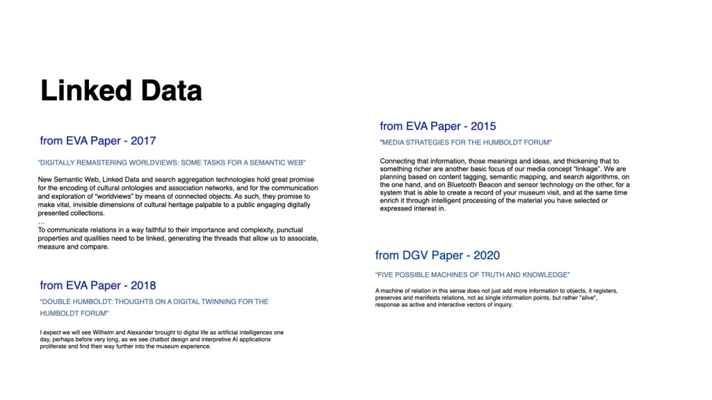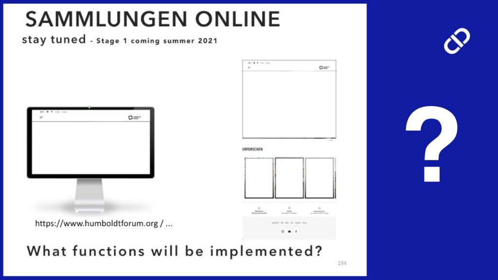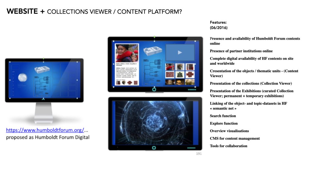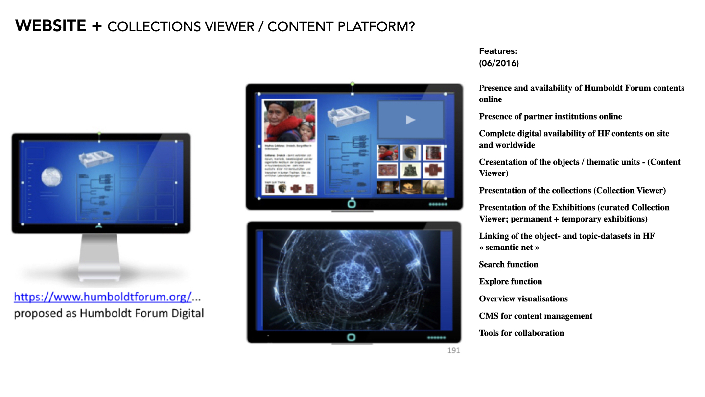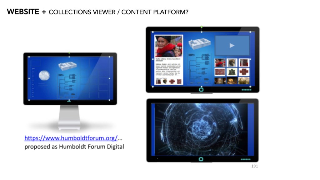 The culmination of this was the full content platform, a content viewer, proposed in various formulations as Collections Viewer, Content Cosmos, and Humboldt Forum Digital.