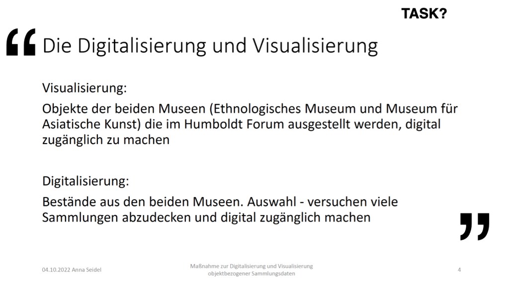 Within the last ten years, dozens of museums (to speak of germany alone) have digitalized hundreds of thousands of objects each, stemming from collections activities around the world, across historical periods, and inevitably with heavy preponderances in the colonial period under colonial contexts. In every case, visions, strategies, concepts, plans and tasks for the process of digitalization to undergo were (more or less explicitly and more or less effectively) developed and implemented by documentation and digitalization workers and teams, producing useable and measurable results.