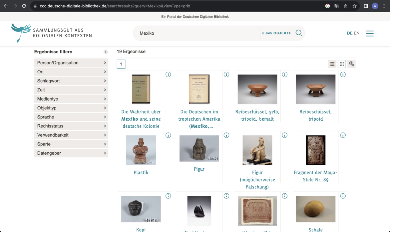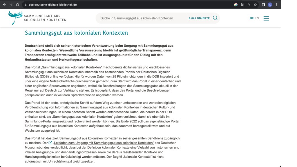 The sub-platform of the Deutsche Digitale Bibliothek, dedicated to aggregating collections data on collections from colonial contexts federally across Germany, has invested in linked data structuring for expressing detailed provenance chains on objects that have been sufficiently researched. This sets a new standard for the role linked data can play in digital collections displays with the complexities of colonial contexts and continuities as subject matter and medium at once.