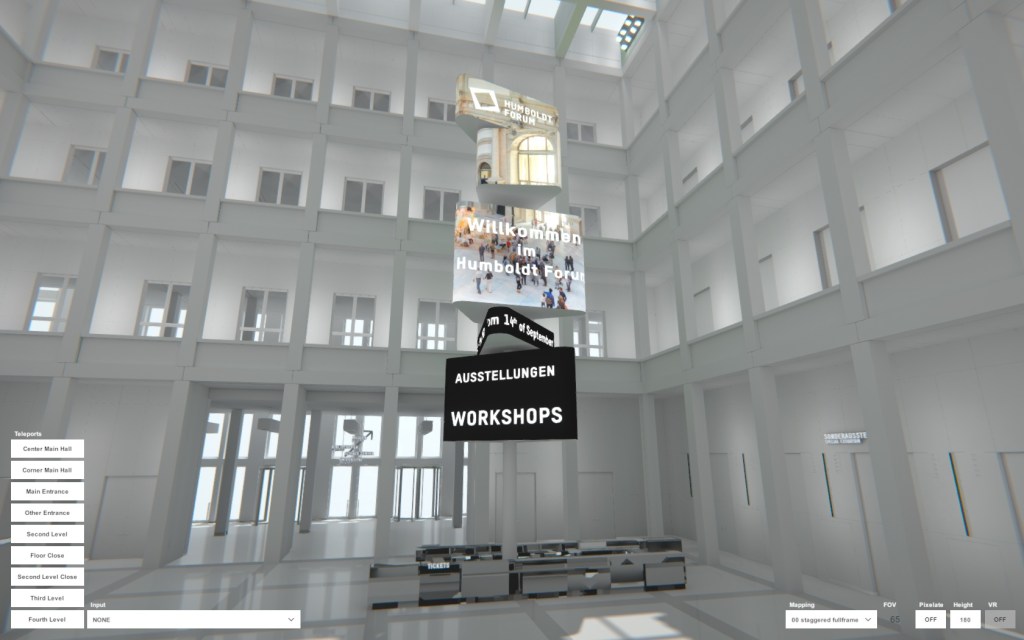 Working closely with Ali Hossaini, who provided a brand concept in 2018 and vital guidance on the technical implementation. Animations by Rafael Calleja, Lucius Fekonja and Felix Rasehorn, Jessica Palmer and Chloê Langehorn, Ansgar Bloyinski, and Andreas König of the Humboldt Forum digital department; generative artworks by Artificial Rome and schnellebuntebilder. Video hardware planning, programming and implementation by Intermediate Engineering.