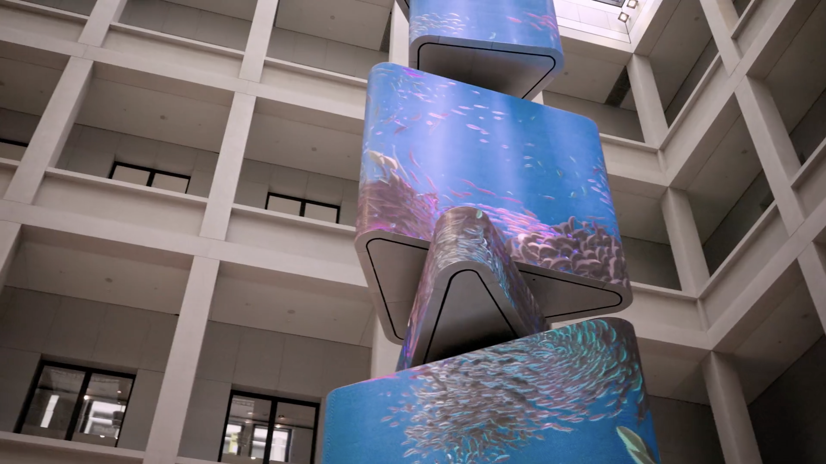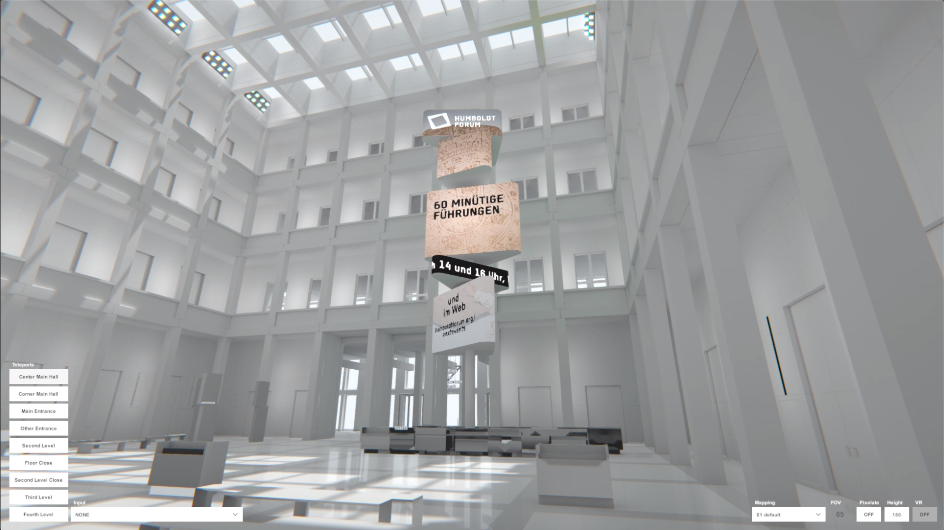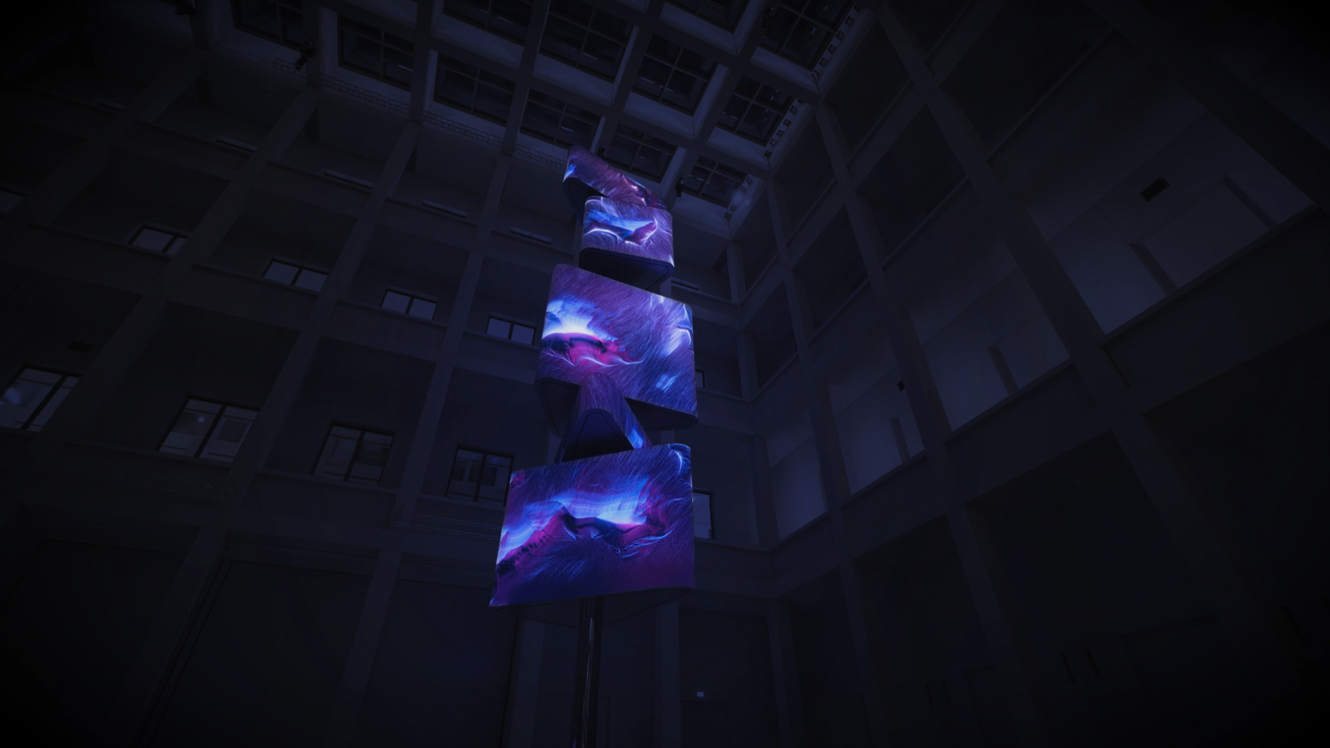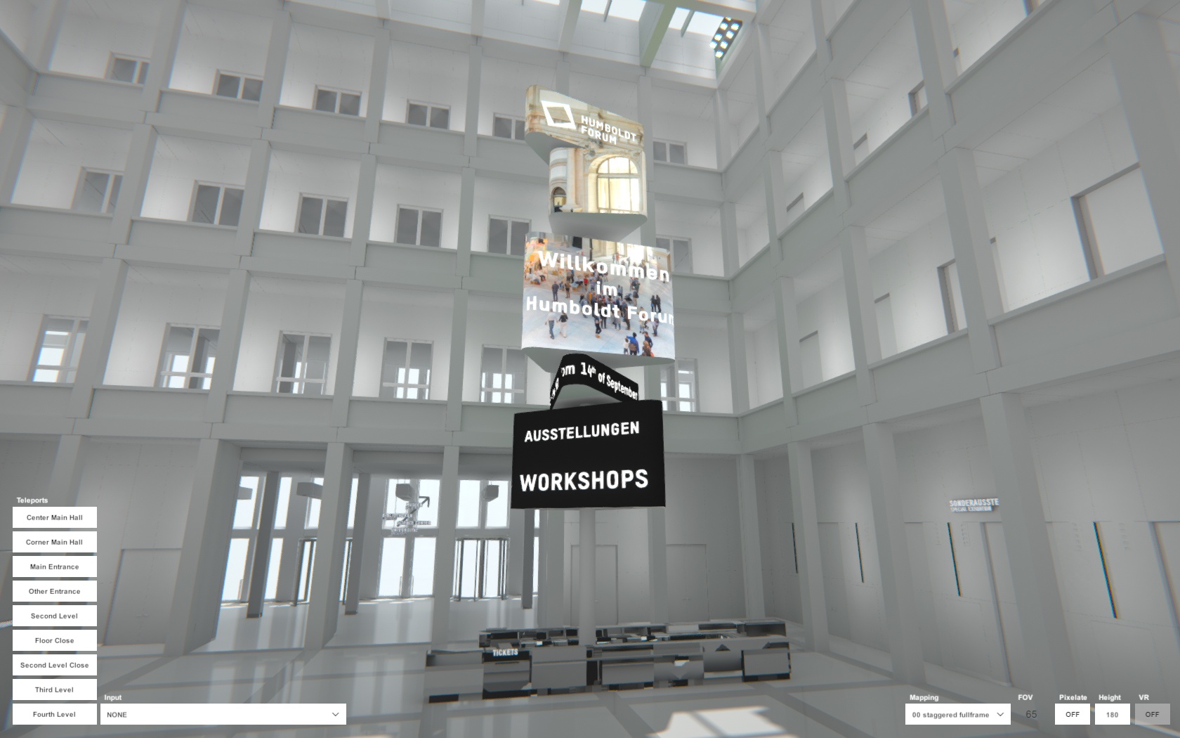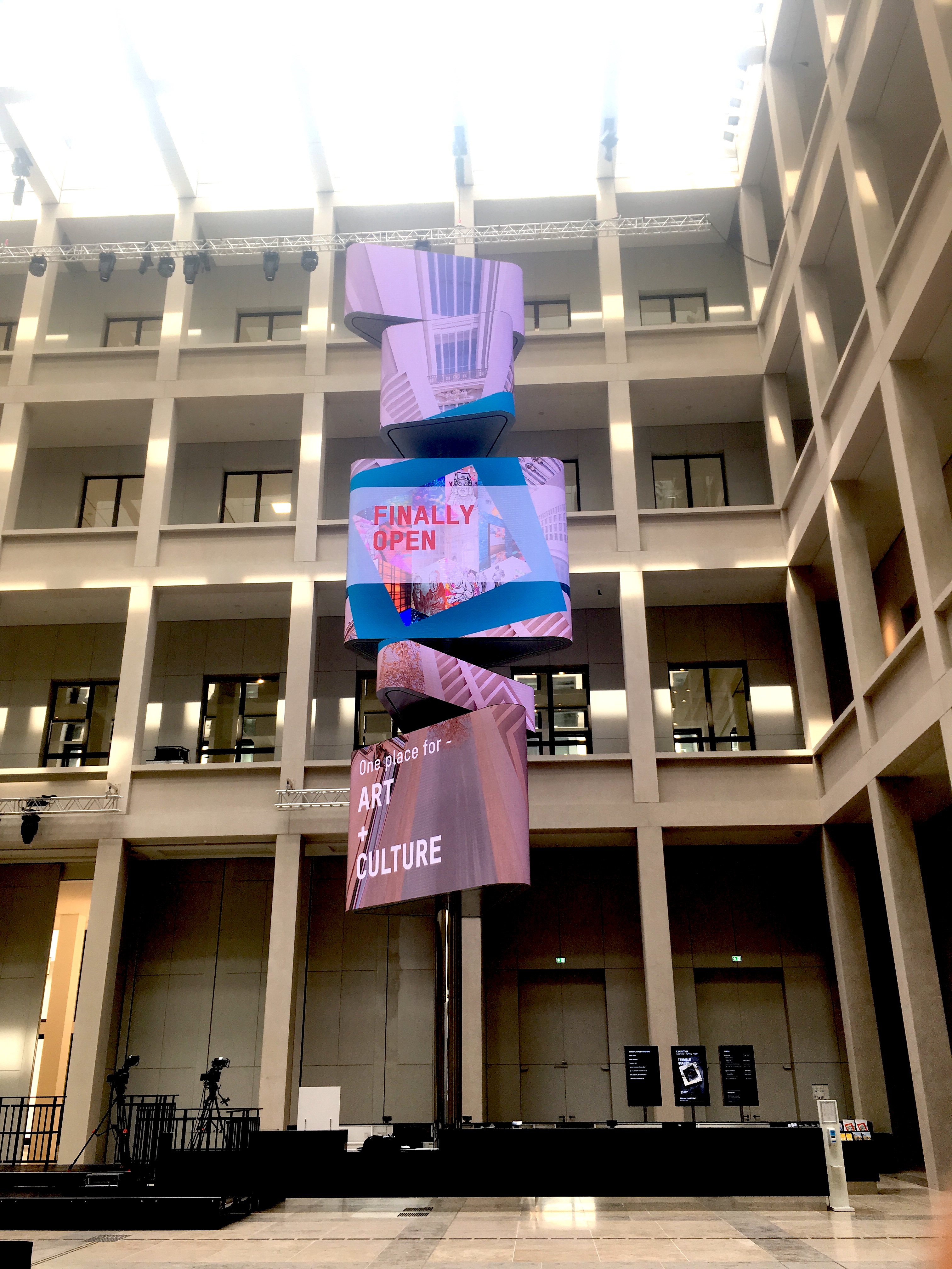 Content strategy, creative direction and project management on the project of a 25m high LED media tower in the central foyer of the Humboldt Forum. Idea and design for the LED structure by Holzer Kobler Architekturen. Initial content concept for the media tower delivered with the Humboldt Forum Media Concept of 2016 – project delivered for the digital opening 16.12.2020, with an initial content program of announcements and curated artworks, plus operations software and interface for scheduling and controlling content, ready for launch with the physical opening 20.07.2021.