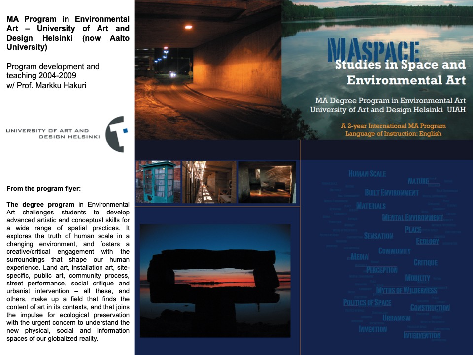 (The MA Program in Environmental Art was launched in the Fall semester of 2004 by Prof. Markku Hakuri. I joined the program for its first semester and worked with Prof. Hakuri to establish the mission and structure of the program, as well as teaching a large portion of its course offering – the full course program is shown further down. )