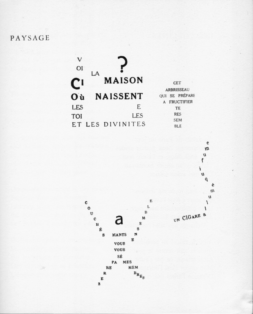 Historically, visual poetries originate in an exploration of, or in an exultation in, the visual forms of language. Whether we consider the millennial arts of calligraphy (East Asian, Islamic or European), the ancient tradition of shaped-text or “pattern” poetry (Simias of Rhodes, George Herbert, Guillaume Apollinaire, etc.) or the particularly modern practice of spatialized free verse that begins with Stéphane Mallarmé at the end of the 19th Century, visual poetry emerges where writing realizes the complementary potentials of its own visual forms.