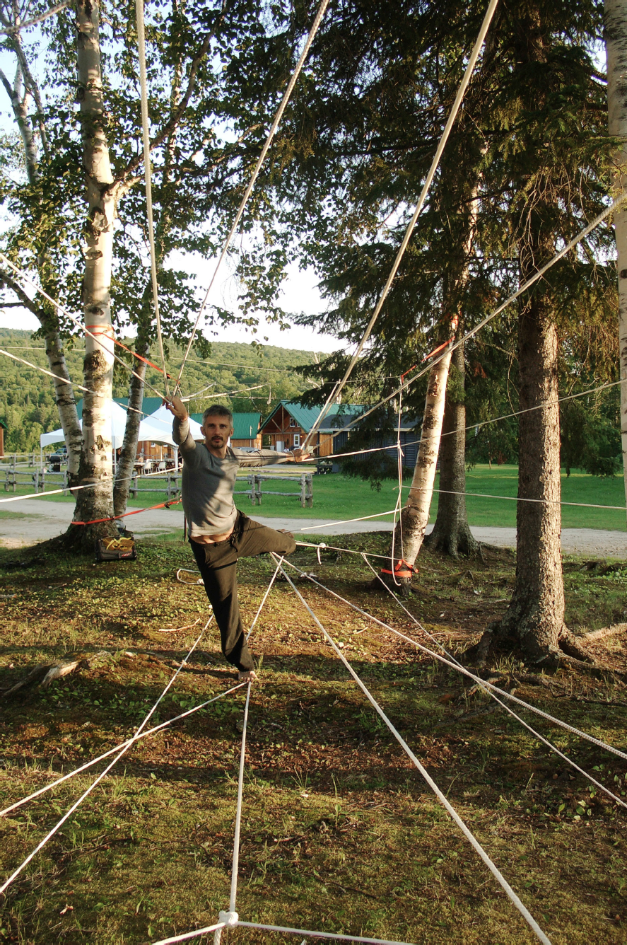 3. Take a length of elastic rope from the box provided. (There are 16 of these, cut to 25ft lengths) Approach the loom from the near/narrow end. Tie one end of your rope on to the black loop rope forming the entrance ring. Draw, thread, stretch, tie or wind the length of your rope as needed to make the loom more the way you would like it. Repeat as necessary to achieve the desired result.